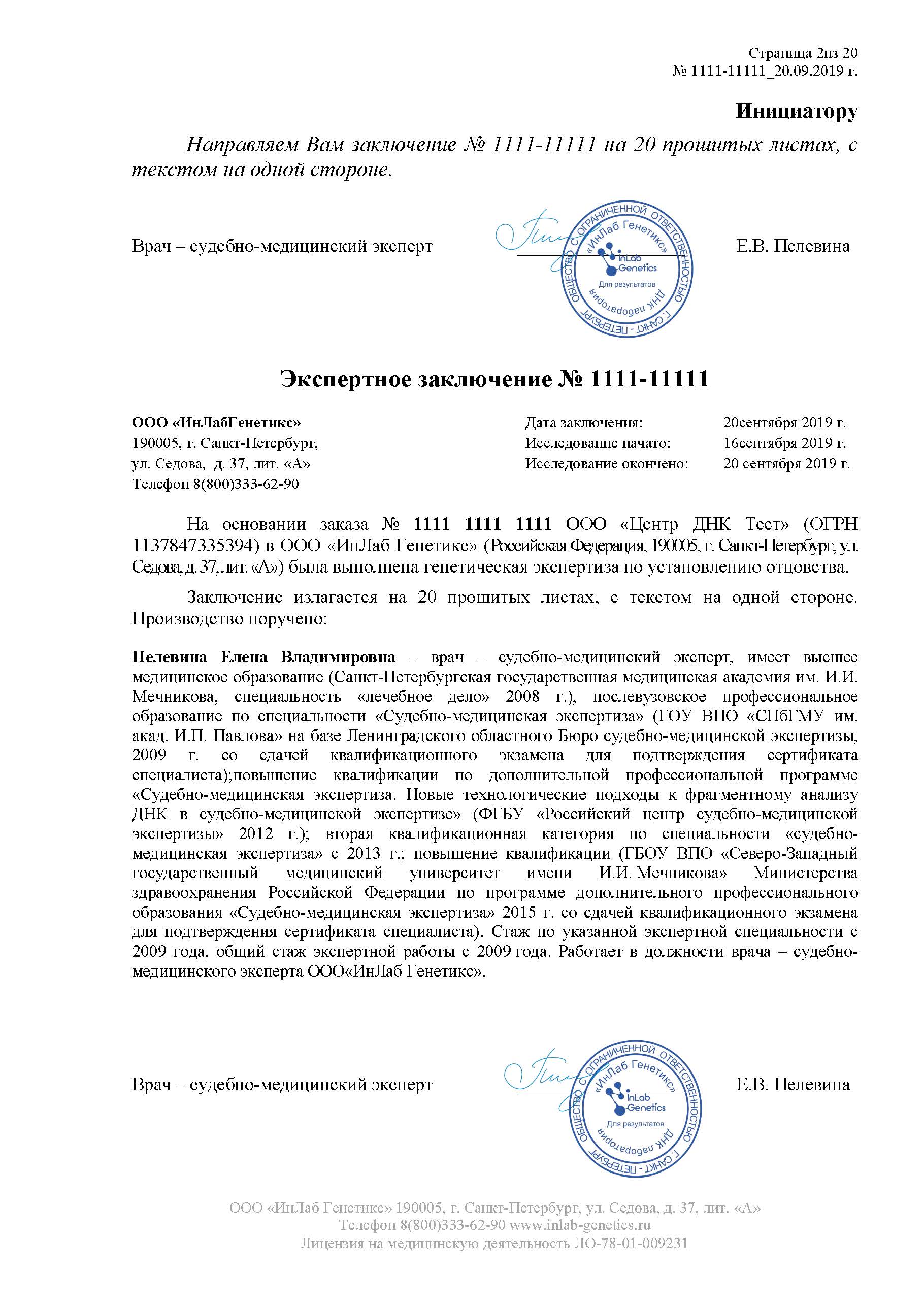 Мы проводим исследование в строгом соответствии с законодательством РФ и с соблюдением всех процессуальных нормативов. В результате генетического анализа будет подготовлено полное экспертное заключение. Это многостраничный прошитый документ, содержащий всю необходимую для суда информацию, который заверяется печатью лаборатории и подписью эксперта-генетика.